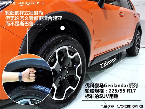 斯巴魯XV定位于一款跨界車型,外觀看上去很時(shí)尚。但是斯巴魯XV 220mm的離地間隙很明顯已經(jīng)超過了大部分城市SUV,同時(shí)225/55 R17的優(yōu)科豪馬輪胎采用是Geolandar系列的,這不折不扣的SUV用胎。 斯巴魯XV的長寬高分別為4450*1780*1570mm,軸距為2635mm,整體車身尺寸和東風(fēng)日產(chǎn)逍客、三菱ASX勁炫相似。而進(jìn)入內(nèi)部來看,斯巴魯XV車內(nèi)顏色以黑色為主,突出了強(qiáng)烈的運(yùn)動氣息,4.3英寸的液晶屏能方便駕駛者操作控制車內(nèi)信息。