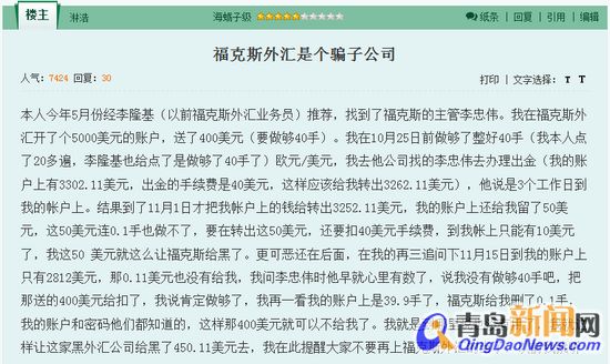 ????青島新聞網(wǎng)訊 近日,本網(wǎng)接到一位市民陳先生的爆料,他稱自己在青島福克斯外匯公司辦理的外匯交易中,被其公司“黑”掉部分錢財,致使他利益受損,而本來約定做夠40手交易,便能額外得到的400美元,也不見蹤跡。最近,記者為了深入了解此事的來龍去脈,聯(lián)系到了事件雙方。???