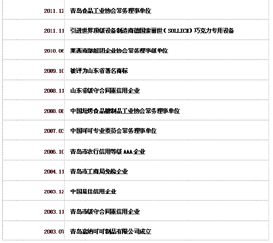 ????公司取得了ISO9001-2000管理體系認(rèn)證、HACCP認(rèn)證、QS認(rèn)證、CIQ出口商檢注冊、美國FDA認(rèn)證、GMP認(rèn)證等證書。公司的商標(biāo)“象牙”“巧克力專家”在2010年榮獲山東省著名商標(biāo),“伊芙蓮”在2013年榮獲“青島名牌”稱號。?